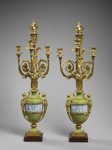 - Candélabre à deux bras de lumières formés d'un vase en porcelaine verte, d'un bandeau de biscuit blanc à fond bleu et à deux anses formées par des harpies