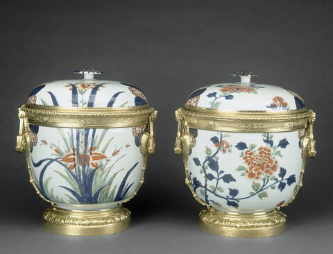 - Coupes couvertes à décor de plantes, de fleurs et de rosaces bleu, rouge et vert sur fond en porcelaine du Japon Imari. Les coupes ont reçu leur monture peu après leur fabrication. Elle comporte autour du couvercle une bordure d'oves, autour de la base une bordure de coquilles alternant avec des palmettes de feuillage et, pour les relier, deux frettes supportant les deux anses. Chaque frette arbore de haut en bas une fleur de lis, une coquille et un trident, entre deux dauphins.