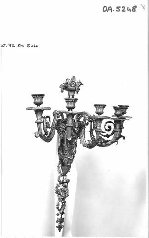 - Bras d'applique à cinq lumières. La tige est formée d'un vase allongé dont la panse unie est recouverte à la partie inférieure de rinceaux feuillagés en relief et ornée à la partie supérieure d'une tête de femme entre deux têtes de satyres. Le col du vase, allongé et entouré d'une tige de laurier, porte une coupe de fruits. Au culot est suspendue une chute de pampres qu'encadrent deux branches de laurier entrecroisées. Les bras cannelés et garnis de feuilles d'acanthe soutiennent à leurs extrémités un binet godronné et une bobèche balustre.