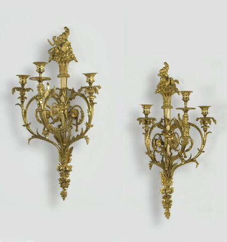 - Bras d'applique à trois lumières, bronze ciselé et doré, tige à carquois cannelé surmonté d'un couple de tourterelles sur un nuage et terminée par un culot de feuilles d'ornement.