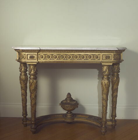 - Console rectangulaire à angles de devant arrondis, en bois sculpté et doré. La ceinture, bordée en haut d'une moulure feuillagée, est ornée d'une frise de rosaces inscrites dans des cercles et séparées par des fleurons. Elle repose sur quatre pieds balustres entourés de tiges de laurier en spirales, et surmontés de chapiteaux à oves, à rubans et à guirlandes de fleurettes. Un croisillon d'entrejambes, garni en son milieu d'un vase à godrons et à pomme de pin, réunit les pieds. Dessus mouluré en marbre blanc.