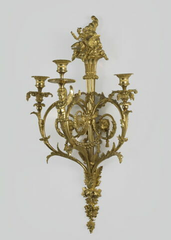 - Bras d'applique à trois lumières, bronze ciselé et doré, tige à carquois cannelé surmonté d'un couple de tourterelles sur un nuage et terminée par un culot de feuilles d'ornement.