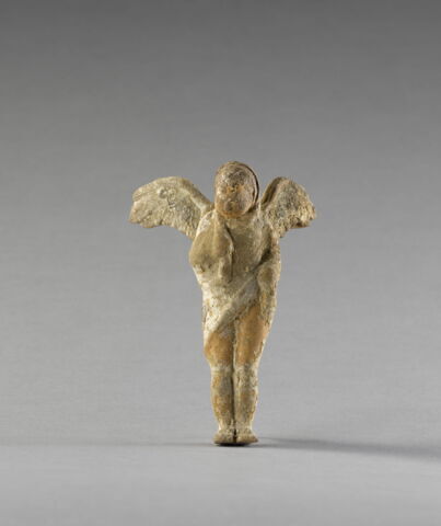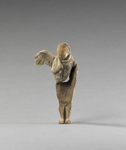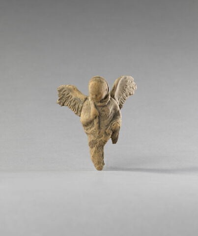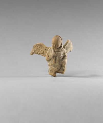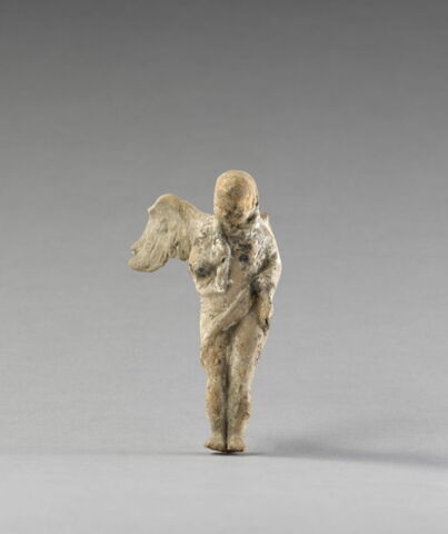 Technique : moulé (même moule que Myr 131, Myr 133, Myr 134, Myr 135, Myr 136, Myr 137, Myr 138), engobe, peinture (peinture blanche sur l'himation et l'aile), trou d'évent (rond dans le dos)