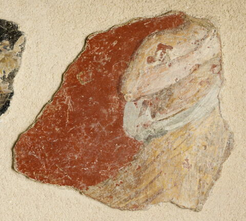 105,6 : PEINTURE MURALE(FRAGMENT) ; DESCRIPTION : HOMME(RESTES,BUSTE,PETASE) 8 x 6