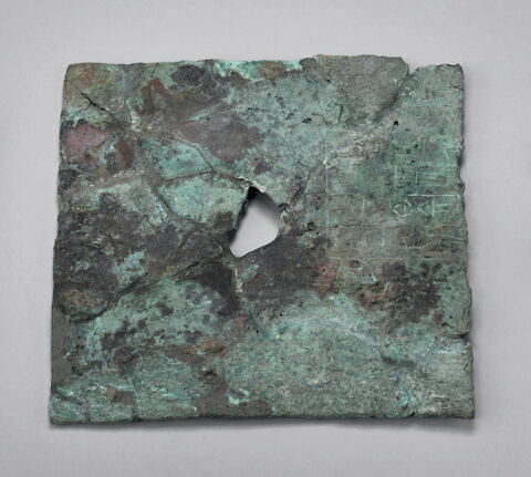 Précision sur l'objet : Plaque carrée percée en son centre - Inscriptions