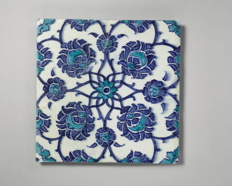 Titre : Carreau à décor de fleurs épanouies saz et rosettes ponctuant un rinceau en forme de fleur - Description/Features