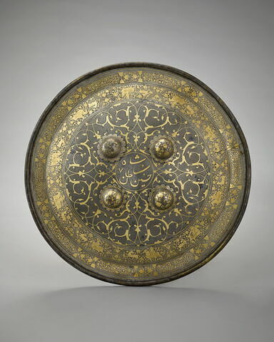 - Description dans l'inventaire Rothschild, département des Objets d'art : "Bouclier de forme ronde en fer damasquiné d'or. Au centre, quatre rondelles damasquinées d'or en relief. Inde, XVIIIe siècle. D. 0,37".